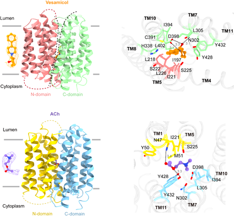 Structural insights into VAChT neurotransmitter recognition and inhibition