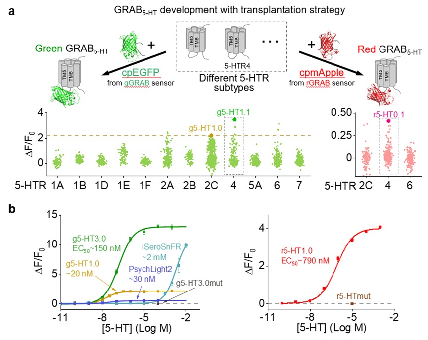 Improved green and red GRAB sensors for monitoring spatiotemporal serotonin release in vivo
