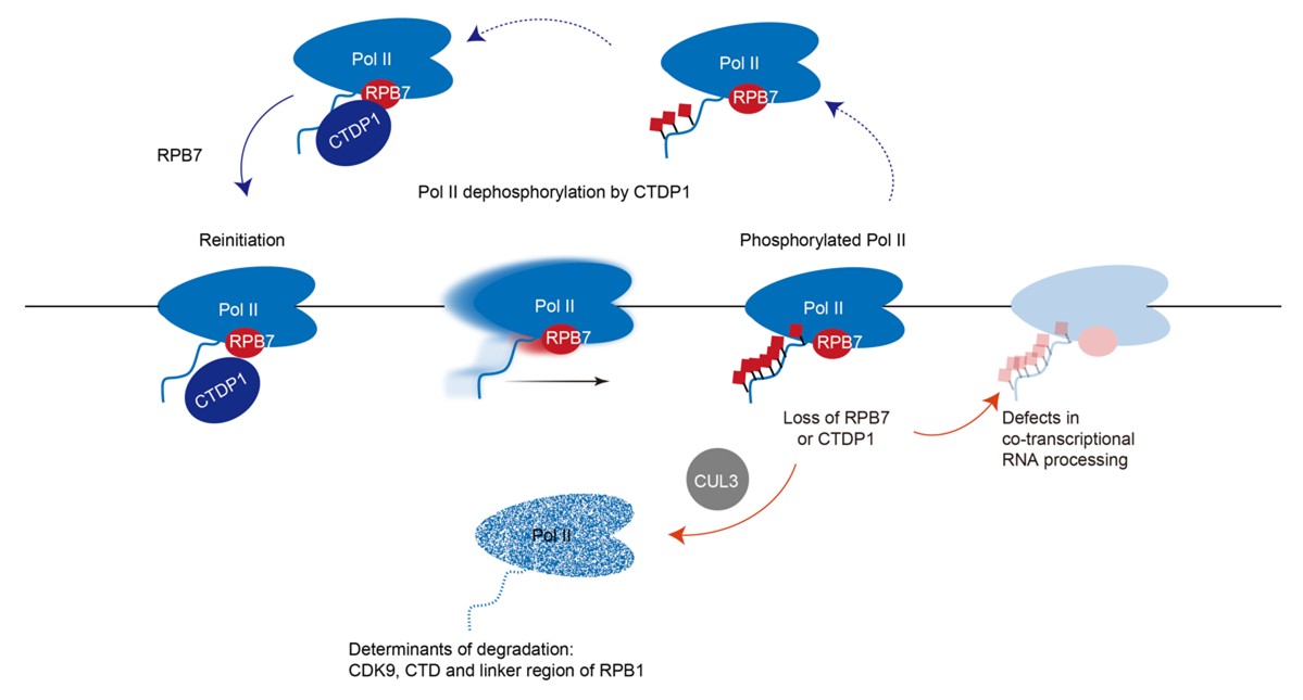 CTDP1 and RPB7 stabilize Pol II and permit reinitiation