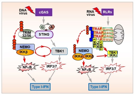 NEMO–IKKβ Are Essential for IRF3 and NF-κB Activation in the cGAS–STING Pathway