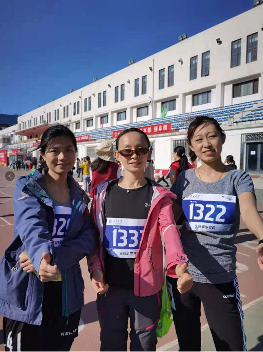张红梅(左)老师、蒋艺丰(中)老师和裴霞(右)老师准备参加女子A组800米决赛。