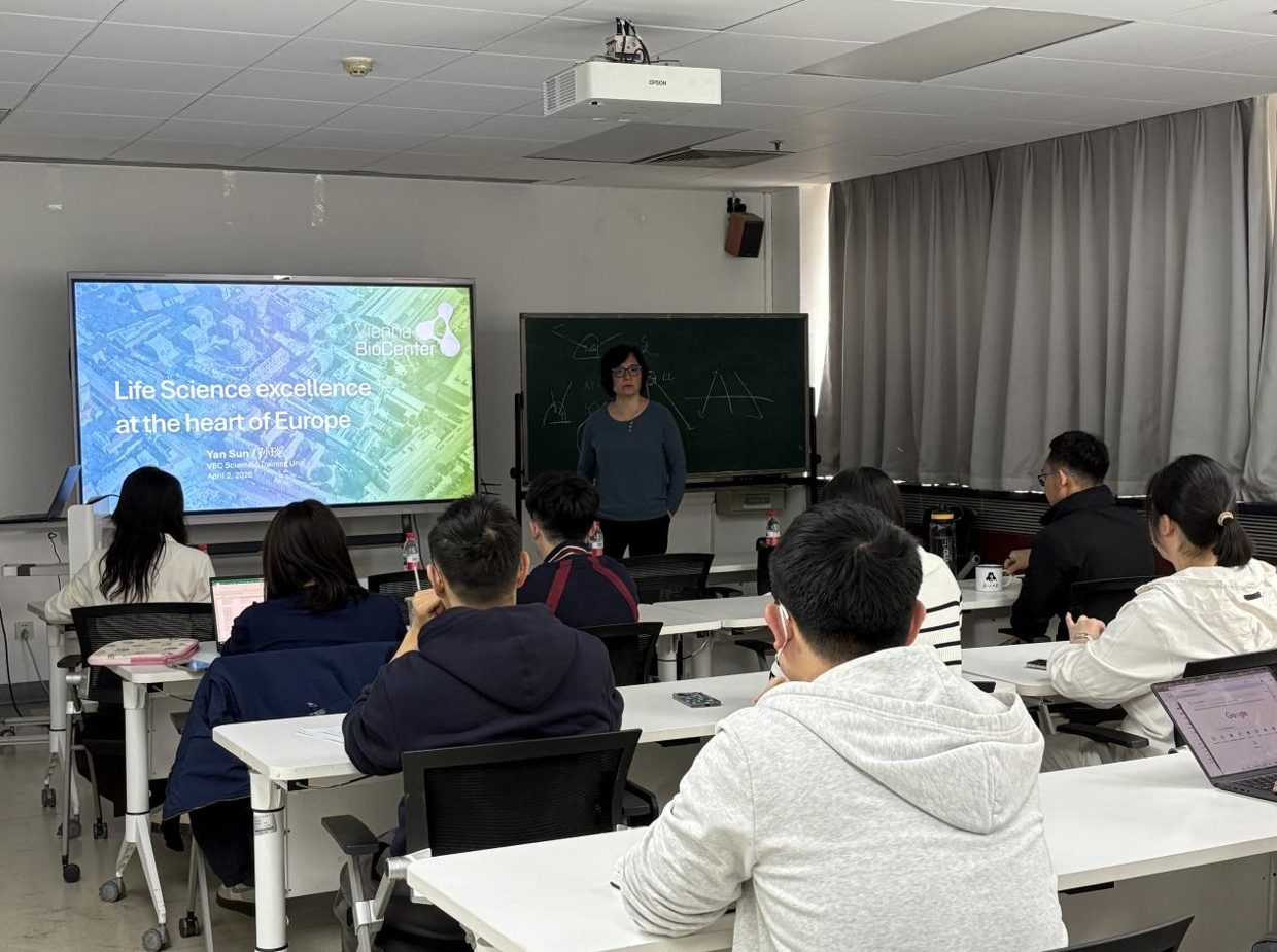 随后,Sun Yan博士为学院师生作题为“Life science excellence at the heart of Europe-Vienna BioCenter PhD and postdoc programs”的专题宣讲。李湘盈研究员主持活动。Sun Yan博士全面介绍了维也纳生物中心的科研布局、学科优势与国际合作平台,并重点解读了Vienna BioCenter Interdisciplinary Postdoctoral Program的项目特色、申请条件与发展路径,为有意赴海外深造的师生提供了详尽信息和实用建议。
