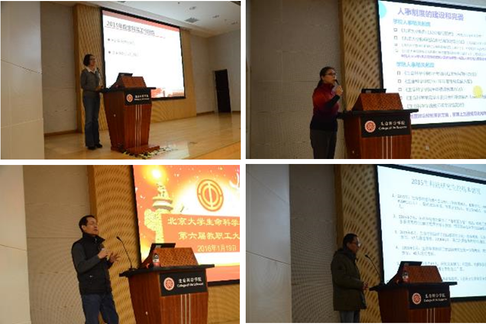 上午第一阶段教职工大会以工作报告为主,由党委副书记瞿礼嘉教授主持。首先,吴虹院长代表学院领导班子对照2014年提出的工作计划,有针对性地总结了2015年度学院各项工作的完成情况,并重点强调了多项亮点工作,包括院庆、教学改革、科研平台建设进展、学院网站改版、新科研大楼封顶、新标本馆落成等。同时,吴虹院长明确表示人才引进工作是学院2016年的工作重点,学院将在加强学院核心竞争力的基础上有针对性地引进优秀人才。随后,柴真书记介绍了学院在人事制度建设方面的工作进展,并公布了2015年度绩效测算原则;同时也梳理了学院的安全管理工作,强调了安全工作考评规则,希望全体教职工时刻重视实验室安全工作。蒋争凡教授做了学院研究生教学工作报告,介绍了学院2015年研究生基本情况,并重点梳理了2015年的创新及亮点工作,与大家一起共同探讨了学院新的学位论文要求和答辩程序。工会主席范六民教授向大会介绍了新一届工会的工作宗旨,以及在过去一年里取得的傲人成绩,并对2016年学院工会工作进行了展望。在新PI介绍环节,李晟研究员和杨竞研究员分别以“野生动物生态与保护实验室”和“神经退行性病变的分子机制”为题作了自我介绍,增进了大家对这两位新PI的了解。