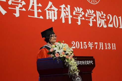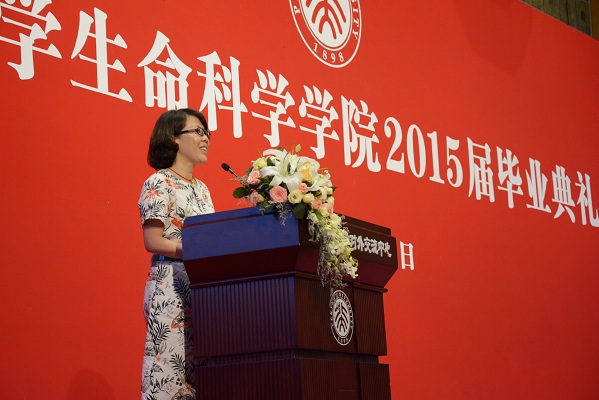 毕业生家长代表朱嘉卉女士在发言中回顾了自己女儿在北大充实快乐的四年时光,表达了对北大的由衷感谢。针对生命科学学科科研压力较大的情况,她希望孩子们能学会生活,为自己减压。她以自己的教育理念鼓励毕业生们,要为推动人类社会的进步而努力。