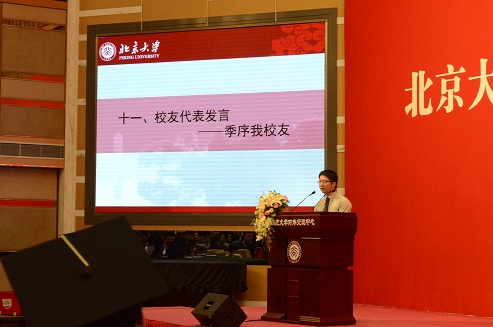 接着,2015届本科毕业生代表陆天、博士毕业生代表任庆鹏相继代表毕业生发言。他们回顾了燕园求学生活的经历,分享了自己的感悟与收获,表达了对北大、对学院的深厚感情。陆天以四个感谢与燕园作别,任庆鹏则以三个问题展望北大人的未来。