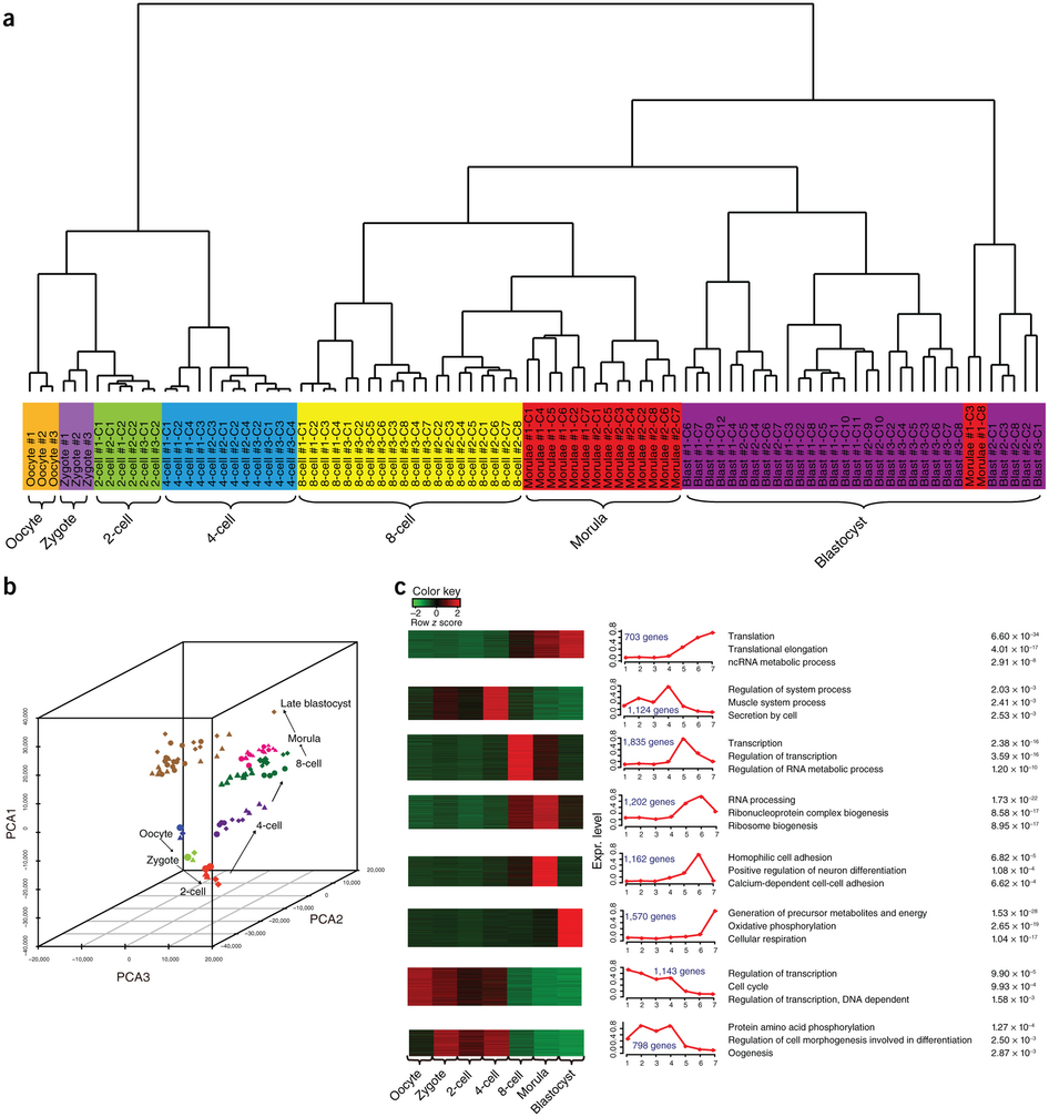 由汤富酬研究员研发的单细胞RNA-Seq转录组测序技术为深入探讨人类胚胎发育的奥秘提供了新的技术路线。该研究团队利用该测序技术对处于不同发育阶段的早期胚胎的90个单细胞以及人类胚胎干细胞系(hESCs)的34个单细胞进行了详尽的分析,构建了世界上最完整的人类胚胎发育基因表达图谱,检测出了22,687个母源表达基因,其中包括8,701条长链非编码RNAs(long noncoding RNAs,lncRNAs),相比于以往通过cDNA微阵列检测出的9,735个母源基因数量大大增加。