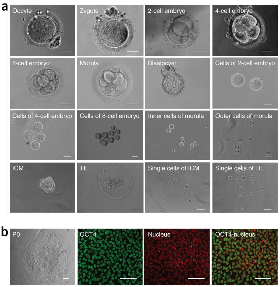 研究人员还首次将单细胞RNA-Seq高通量测序技术与RNA从头组装生物信息学分析技术相结合,从人类植入前胚胎中发现了两千七百多种全新的lncRNA,其中许多lncRNA表达具有发育阶段特异性,很可能参与了植入前胚胎发育过程中的细胞命运决定。此外,他们还首次检测了建系过程中最早阶段(第0代)的人类胚胎干细胞的转录组,解答了人类囊胚中的上胚层(epiblast)细胞和体外培养的人类胚胎干细胞之间的基因表达模式是否相同这一由来已久的问题,证实囊胚中的上胚层细胞和建系过程中最早期的人类胚胎干细胞具有显著不同的转录组,其中有一千四百多个基因显示差异性表达。