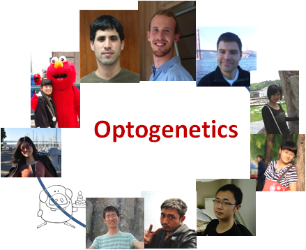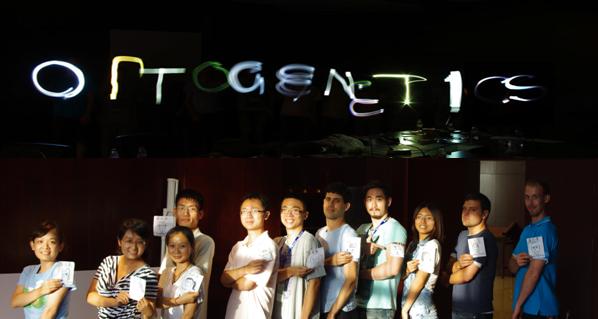 optogenetics组的幸运猫 optogenetics团队在室内关灯后利用个人手机发光、增长曝光时间所拍摄的团队logo(上),和同一室内每个组员手持自绘头像的合影、他们还为每个美国组员起了有趣又贴切的中文名字(下)