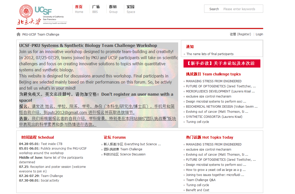 虽然团队挑战活动本身仅历时四天,但前后的准备和组织工作,则历时近八个月。尤为特别的是,学生在其中,担任了主要和关键的作用:首先是前期制作网上论坛(http://bbs.ctb.pku.edu.cn/putc/index.php)、招募队员、确定挑战主题等筹备工作。其次,团队所确立的4个挑战题目,也是学生根据自身兴趣,经个人提议、大家讨论、团队评选和选择后所确立的系统与合成生物学领域内,或前沿、或热点,或有趣、或有实用意义,并无确定和已知答案的开放性问题(Challenging Topics)。并在确定主题后,各小组又为各自的命题作了充分的准备和热身活动:如文献调研和阅读,组内讨论等等,均是自发和自觉的。正因为前期准备的充分,保证了后期挑战活动的顺利实现,也反映了科研过程中厚积薄发,兴趣主导的意义。