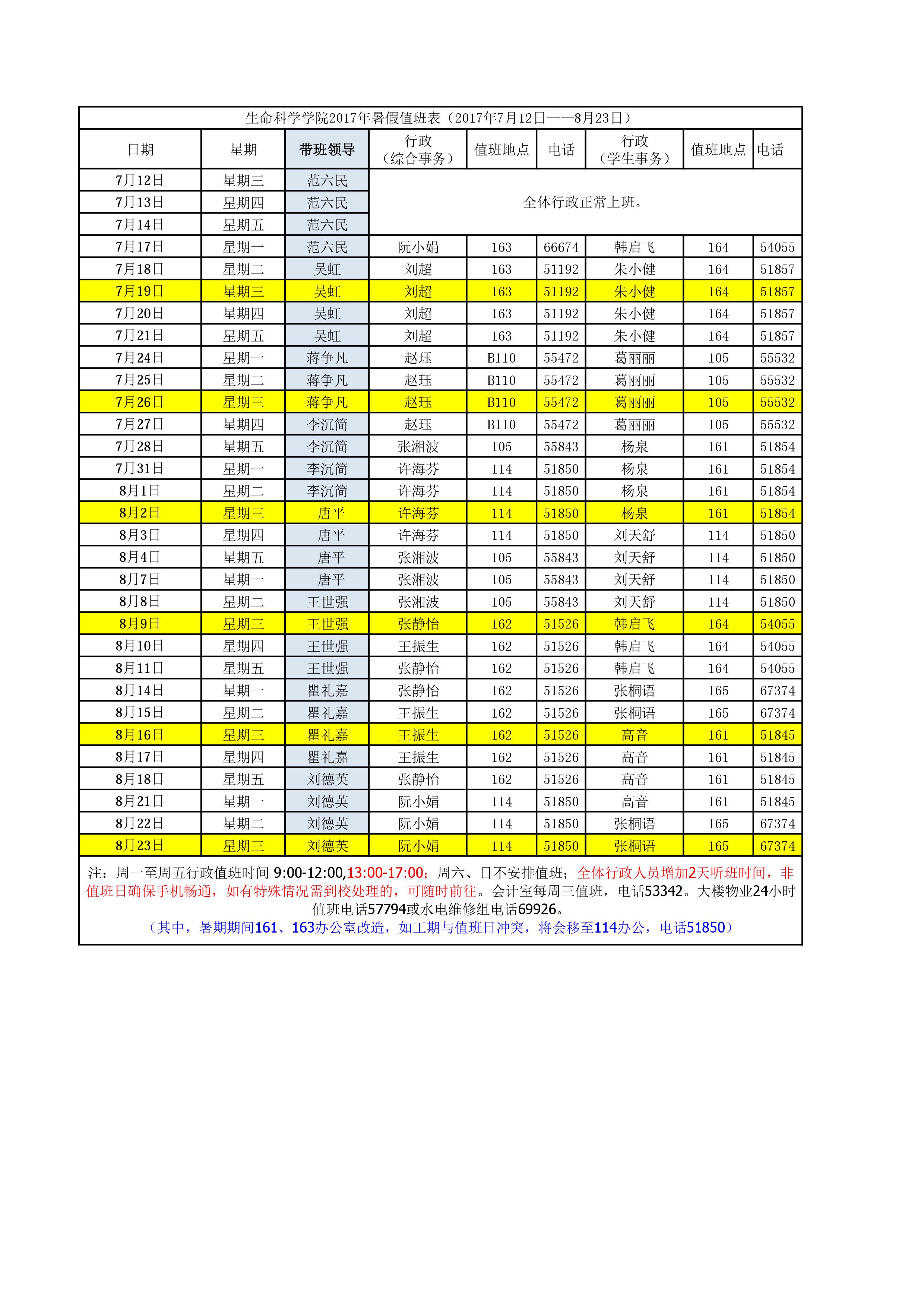 【7月30日信息更新】由于161办公室改造已完成,下表中所有办公地点为114办公室的,均改到161办公室值班。
