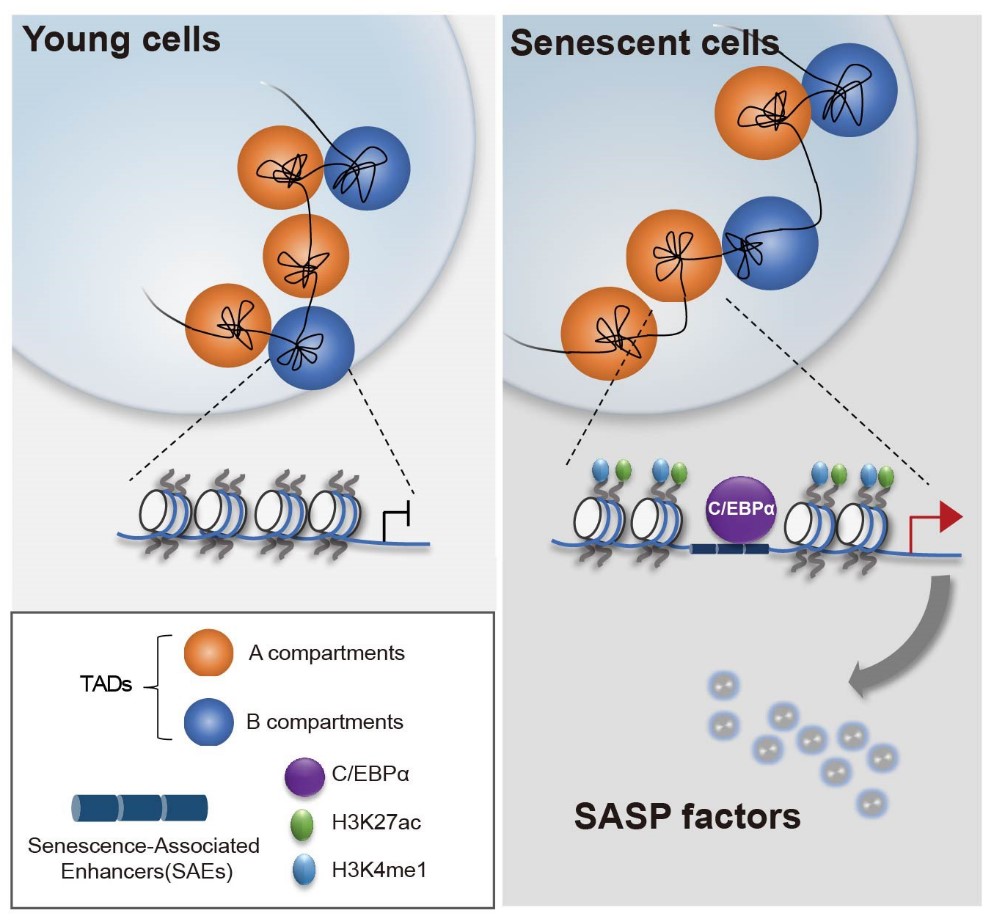 细胞衰老过程中活跃增强子调控SASP表达的机制模式图