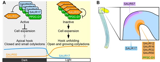 本研究发现的具体分子机制是:发现有两组功能不同的SAUR基因参与调控光介导的子叶和顶端弯钩打开的过程,一组以SAUR17为代表,另一组以SAUR50为代表。在黄化苗的子叶和顶端弯钩中,SAUR17蛋白大量的积累并优先与磷酸酶PP2C-D1结合,使得少量存在的SAUR50不能与磷酸酶PP2C-D1结合,保持酶活的PP2C-D1抑制了子叶和顶端弯钩内侧细胞的伸长,进而维持了暗中黄化苗子叶和顶端弯钩的闭合。而在去黄化过程中,SAUR17的转录被光快速地抑制,SAUR17的蛋白水平迅速下降,与此同时,SAUR50的转录被光快速上调,SAUR50的蛋白大量积累并与磷酸酶PP2C-D1结合,抑制了磷酸酶PP2C-D1的活性,从而解除PP2C-D1对子叶和顶端弯钩内侧细胞伸长的抑制,最终促使子叶和顶端弯钩打开。