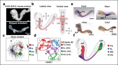 经典的理论认为早期内胚层划分为前肠、中肠和后肠3大区域,然而区域边界并不清晰。该研究通过精确的显微解剖,分离出特定位置的小鼠内胚层组织,随后进行高精度单细胞转录组测序。通过基于基因共表达网络的多层分类算法,根据核心调控基因鉴定出内胚层细胞的不同类群,进一步结合内胚层组织的空间信息和标志基因的原位杂交,确定内胚层中主要细胞类群的空间分布。根据细胞整体分子特征,本研究发现了一类有别于其他三类(前肠、中肠和后肠)基因调控模式的第四类细胞类群,该类群位于内胚层的“前唇部”,因此命名为“前唇细胞”。此外,利用精确的空间信息,本研究首次明确了四大区域清晰的边界。