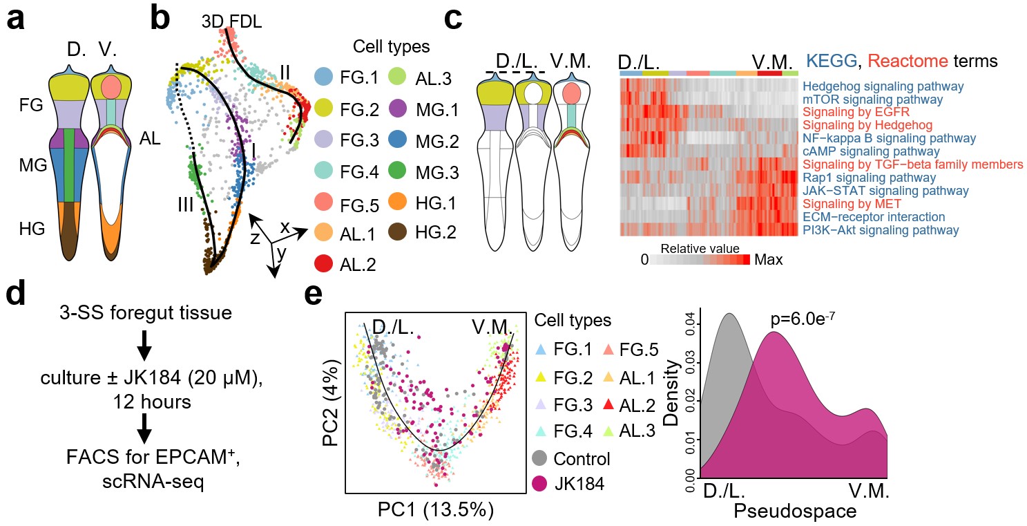随后,通过基因调控网络分析,进一步将内胚层4大类群细分为13类亚群,并确定了其空间分布。依此在三维水平上确定了小鼠内胚层的轴向,揭示了各个轴向特异的调控因子和细胞信号。该研究发现Hedgehog通路富集在内胚层前段背侧,在内胚层组织体外培养时抑制Hedgehog信号通路会促进细胞向腹侧细胞状态转变。基于内胚层各个细胞类群的空间分布和发育路径,该研究提出了“中线特化”的假说:在内胚层发育的过程中,背侧和腹侧的中线受到了多种信号的诱导,特化成沿着内胚层前后分布的中线区域,这些中线区域在很大程度上奠定了内胚层发育成背腹侧胰腺、肝脏、甲状腺、气管/肺等消化道附属器官的基础。