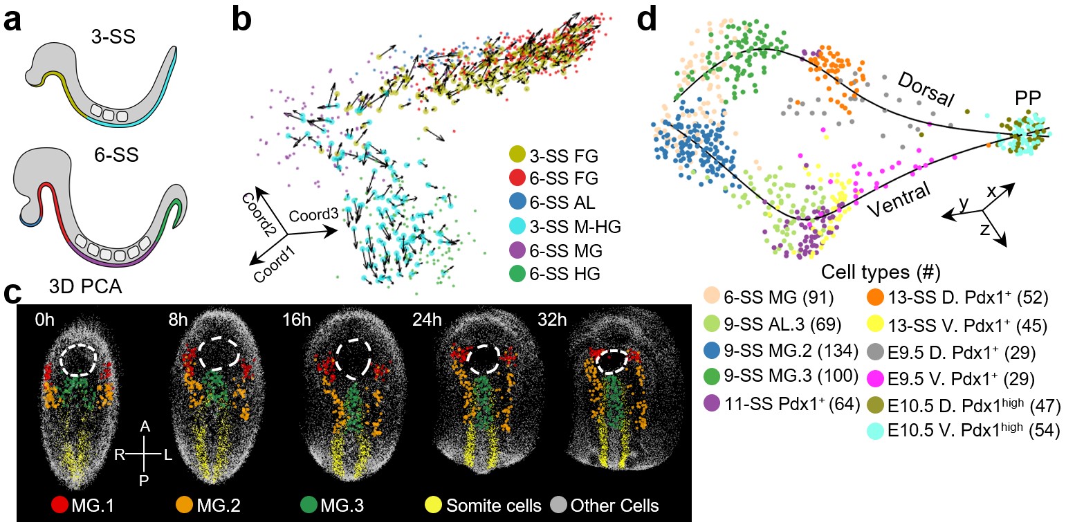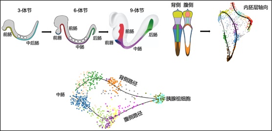 随后,该课题组对胰腺早期分化路径进行了详细研究。此前,领域内普遍认为胰腺有两个内胚层起源,分别位于背腹侧前肠区域。但通过单细胞发育路径分析、体外成像追踪数据分析和遗传追踪,该研究确定了胰腺祖细胞共起源于中肠内胚层,随后分别沿着背侧和腹侧路径分化成相同的胰腺祖细胞类型。因此,该研究推翻了“胰腺起源于两个前肠内胚层区域”的论断,确定了的胰腺祖细胞来自中肠内胚层的发育路径。