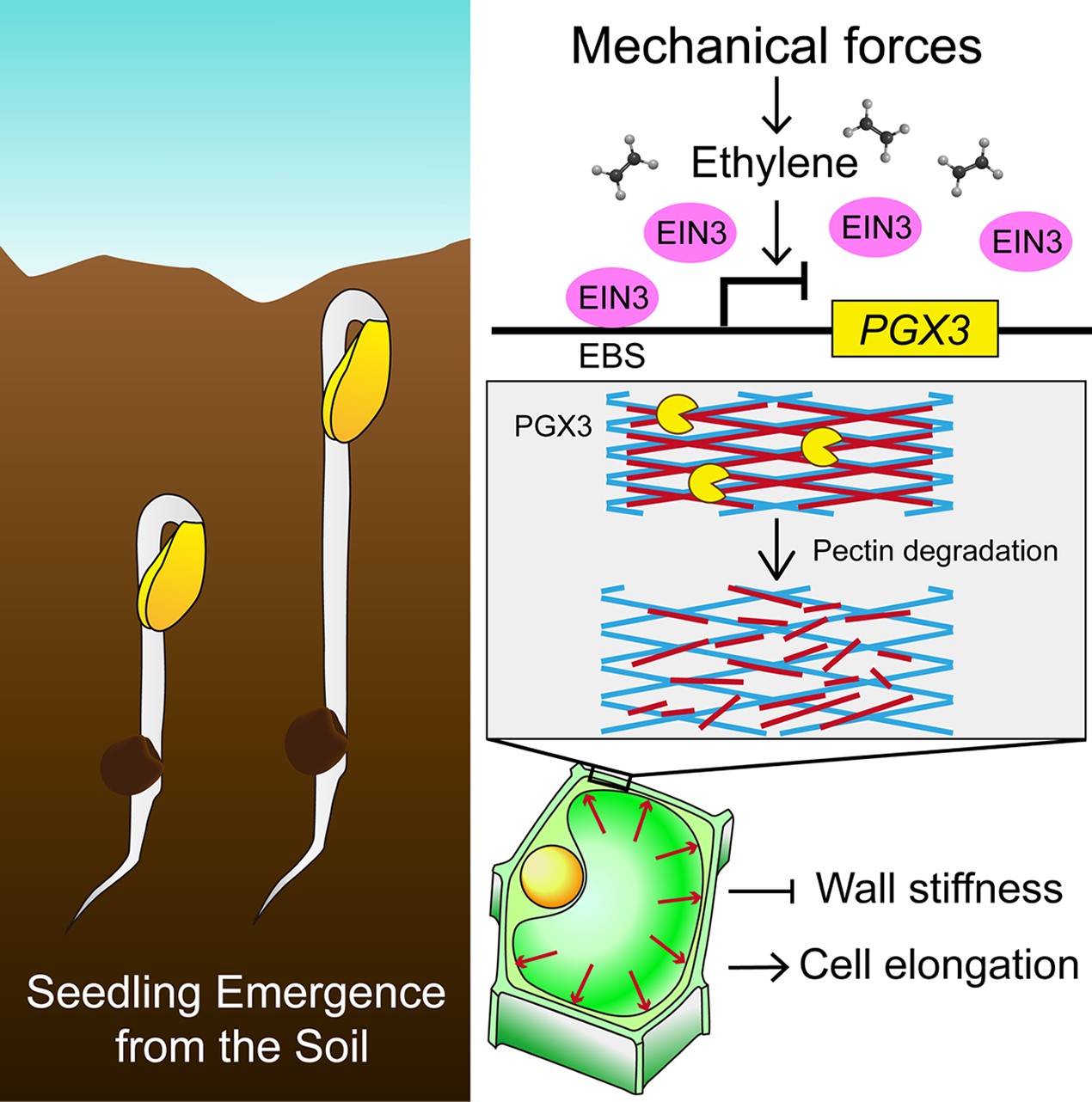 钟上威实验室长期致力于研究植物对土壤环境的适应性,重点关注植物幼苗出土调控的分子机理。为了研究土壤覆盖所带来的机械压力对植物幼苗出土的调控作用,钟上威实验室设计了一个顶盖接触实验方法,让植物幼苗在向上生长中自然触碰到培养皿顶盖,来模拟出土幼苗遇到的土壤覆盖层的机械阻力。利用该系统,他们深入研究了机械碰触对幼苗生长发育多层面的调控作用。首先,表型观察发现,碰触顶盖24小时后,幼苗的下胚轴伸长受到显著抑制。细胞层面研究发现,下胚轴细胞纵向伸长被抑制,且下胚轴细胞壁机械硬度增加。植物细胞壁由多种高分子化合物组成,包括纤维素、半纤维素和果胶。其中,果胶形成基质,纤维素和半纤维素埋于其中,果胶分子的状态(长短、分枝、与其他分子的结合状态等)决定着细胞壁的机械硬度,进而调控植物细胞的生长。检测果胶的分子量分布,发现机械碰触抑制了果胶的裂解作用,使得细胞壁中果胶的平均分子量显著增加。果胶的水解主要由多聚半乳糖醛酸酶(polygalacturonase,PG)介导。进一步研究,发现机械碰触能抑制一类多聚半乳糖醛酸酶PGX3的基因表达,进而抑制细胞壁中果胶的裂解。更有意思的是,机械触碰对PGX3的基因表达抑制快速并且可逆:施加机械压力1小时即可显著抑制PGX3的基因表达,将机械压力撤除后,PGX3的表达水平迅速恢复。多聚半乳糖醛酸酶的酶活对于机械压力的响应与PGX3的表达水平相一致。只有持续不断的机械碰触直至8小时以上,PGX3基因表达水平与多聚半乳糖醛酸酶酶活长时间处于被抑制,植物细胞的伸长才会出现明显变化。在PGX3上游,研究发现植物内源激素乙烯起关键调控作用。机械碰触促进乙烯气体生成,通过乙烯信号通路关键转录因子EIN3,直接结合进而抑制PGX3的基因表达。因此,PGX3位于EIN3下游,调控细胞壁对机械压力的响应,提高在机械压力环境下细胞壁的硬度,减缓细胞纵向伸长,帮助植物幼苗适应土壤覆盖所带来的机械阻力,实现出土存活。