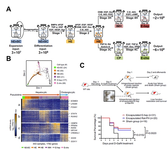 图 (A)体外规模化产生功能化且可移植肝系细胞的流程图。(B)体外肝系细胞分化路径的单细胞转录组分析。(C)诱导得到的肝实质细胞的移植显著提高急性肝损伤大鼠的存活率。