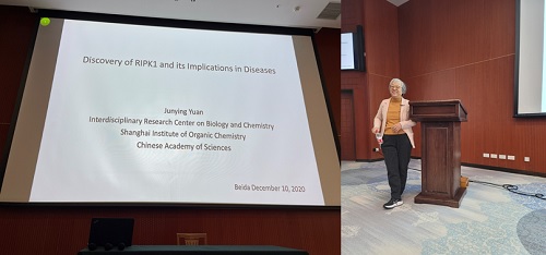 袁钧瑛院士在图书馆科学报告厅做了题为“Discovery of RIPK1 and its implication in human diseases”的学术报告,吴虹院长主持报告。袁钧瑛院士系统介绍了RIPK1的作用机制及其作为药物靶点的巨大潜力。人类RIPK1切割位点变异会阻止caspase-8蛋白酶对其切割,导致细胞凋亡、细胞坏死和炎症信号通路的过度激活,从而引起严重的自身炎症疾病。表明RIPK1与自身炎症性疾病相关,RIPK1抑制剂在治疗单基因和多基因自身免疫,炎性,神经变性,局部缺血和急性疾病如败血症中的潜在应用正在兴起。
