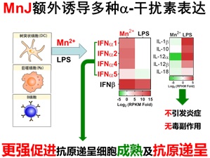 在本研究中,蒋争凡实验室首先发现,游离的锰离子(Mn2+)作为佐剂免疫动物后很快就被代谢,无法有效发挥佐剂效果。他们通过上百种配伍方式筛选,得到了胶体状纳米锰佐剂(MnJ)。该创新性佐剂既能高效激活细胞免疫并促进体液免疫,也能激活黏膜免疫反应并诱导分泌型IgA产生,用作黏膜免疫佐剂。分子机制的研究表明锰佐剂促进免疫应答的机理是:(1)显著促进抗原递呈细胞如树突状细胞(DC)的成熟;(2)促进单核来源树突状细胞(Mo-DC)的分化;(3)增强抗原递呈细胞摄取抗原的能力;(4)刺激CD4+ T细胞的分化;(5)促进生发中心的形成。他们进一步证明锰佐剂的佐剂效果依赖于cGAS-STING和NLRP3-ASC两条信号通路,但有意思的是不依赖于NLRP3炎症小体下游的促炎因子IL-1β和IL-18。小鼠腹腔注射MnJ后能招募大量的巨噬细胞和嗜中性粒细胞,但检测不到IL-1β和IL-18的产生,且Il18−⁄−小鼠、IL-1受体抑制剂或TNFα抑制剂处理都不影响MnJ佐剂诱导的抗体生成。动物模型显示锰佐剂对几乎所测试的所有种类抗原都有效,能显著提高灭活疫苗的效果,甚至可以将灭活病毒的浓度减少到1/100还能达到完全保护的效果。对于易突变的病毒,免疫单联疫苗也能达到交叉保护的效果。另外,锰佐剂制备的肿瘤疫苗能显著抑制肿瘤的生长和转移,并促进瘤内免疫细胞(活化的NK细胞和CD8+ T细胞)的浸润。与其它常用佐剂相比,锰佐剂表现出更为显著的佐剂效果,其可能的分子基础是锰离子不仅诱导β干扰素的产生(如LPS只诱导β干扰素),而且诱导大量的、不同种类的a干扰素,这些额外产生的a干扰素可能以目前还不清楚的机制超强促进抗原递呈细胞的成熟、分化及对抗原的递呈(如图所示)。目前为止,锰佐剂的优异性能已被国内十几个实验室和抗体生产厂家所证实。