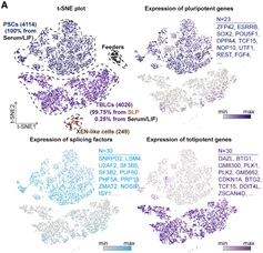 作者分析了先前发表的单细胞胚胎数据,发现剪接因子在早期胚胎发育中是动态变化的,有一类剪接因子在胚胎发育早期低表达,在后期表达量逐渐升高。作者发现敲低这一类关键剪接因子能广泛激活全能性基因(如Zscan4s,Plk2,Btg1/2以及转座子Mervl和Mt2),沉默多能性基因(如Utf1,Tdgf1,Sox2),将小鼠多能性的ESC重编程为全能性状态。同时,将剪接抑制剂Pladienolide B(PlaB)添加到Serum/ LIF培养基中(SLP培养基),能够在体外培养和维持TBLC,且细胞活性和核型正常。与PSCs (pluripotent stem cells) (P0)相比,在SLP培养基中培养5代之后,整体转录组趋于稳定,特异性表达胚胎时期的全能性基因,沉默囊胚时期特异性表达的多能性标记基因,接近体内胚胎的2细胞和4细胞时期(图1)。其次他们发现撤去PlaB后,TBLCs细胞能够转换到多能性状态(图1),说明单个剪接抑制剂PlaB可以操纵这个多能/全能干细胞转换过程。SLP培养条件提供了一个可靠的体外系统来研究全能到多能细胞的转换,且这个系统在分子水平上能够模拟从体内2细胞时期到囊胚时期的发育。