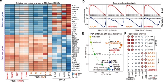 此外,作者比较了TBLCs与已发表的EPSCs和2C-like细胞的转录组测序数据,发现与TBLCs细胞中大多数多能性标记基因被广泛沉默不同,EPSCs仍明显表达多能性标记基因;而在TBLCs中高表达的全能性基因或转座子在EPSCs中表达量很低。最后,作者对TBLCs和EPSCs与小鼠植入前胚胎数据进行了基于转录组的主成分分析以及与2C-like细胞的相关性分析(图3),发现TBLCs明显靠近2细胞和4细胞时期胚胎,EPSCs和2C-like细胞接近多能性囊胚时期,这与最近一个研究组得到的结论一致[4]。