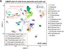 作者进行的功能嵌合实验表明,TBLC具有强大的双向发育潜能,可以产生胚内和胚外组织,包括囊胚时期的TE,E6.5-E7.5胚胎的EPC和ExE,以及发育后期的胎盘和卵黄囊。更重要的是,作者还观察到来源于单个TBLC的荧光标记细胞可以嵌合进入整个E6.5-E7.5胚胎,包括EPI,ExE和EPC(图4)。小鼠胎盘是一个富含血液的复杂器官,为了避免免疫染色产生的假阳性,作者将E13.5嵌合小鼠的胎盘和卵黄囊消化成单细胞,并通过流式富集筛选出有荧光标记的TBLC来源的细胞进行单细胞测序,发现其能够在小鼠体内分化为至少6种胚外和15种胚内细胞类型。本篇文章首次利用单细胞转录组准确追踪出供体细胞的发育谱系,为全能性细胞的功能性检验提供了一个更严格的检验方法。作者使用单细胞测序,证明了TBLC能够在胎盘和卵黄囊中分化为至少6种胚外和15种胚内细胞类型(图5)。