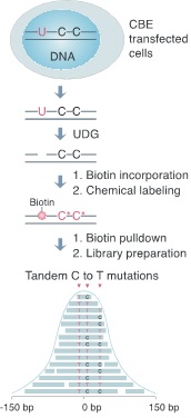 作者通过捕获胞嘧啶碱基编辑器CBE ADDIN EN.CITE ADDIN EN.CITE.DATA [1]产生的中间体(dU),并进行一系列标记和富集 ADDIN EN.CITE ADDIN EN.CITE.DATA [2, 3],获得具有连续C-to-T突变的脱靶信号,并将其命名为Detect-seq(dU-detection enabled by C to T transition during sequencing)技术,该技术的主要技术路线如图1所示。