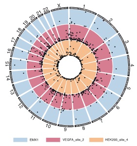 图-2 在三种不同sgRNA样品中鉴定到的Cas依赖型的脱靶位点 其中蓝色圆圈代表脱靶位点(off-targets),红色方块代表靶向位点(on-target) EMX1 n=48,VEGFA_site_2 n=511, HEK293_site_4 n=245