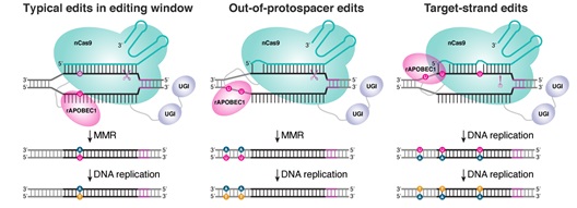 有趣的是,研究人员基于Detect-seq技术还发现了两种新型的Cas依赖型的脱靶编辑:sgRNA结合区域外编辑(out-of-protospacer edit)及靶向链编辑(target-strand edit)(图3)。sgRNA结合区域外编辑即C-to-T的编辑发生在sgRNA结合区域外;而靶向链编辑则是C-to-T编辑发生在sgRNA与DNA结合链。根据Detect-seq的结果,上述两种编辑普遍存在于Cas9依赖型的脱靶位点附近。