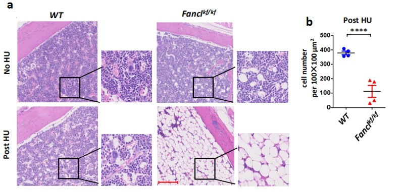 基于FA蛋白在复制压力下的BIR途径中的重要作用,本研究作者推测复制压力可能是造成FA症状的内源性因素。为了验证此猜想,本研究作者构建了FANCL缺失的小鼠模型,通过每日腹腔注射低剂量的复制压力药物HU后,发现持续复制压力能够引发FANCL缺失小鼠的贫血症状,其小鼠造血祖细胞的增殖分化功能异常,最终触发FANCL缺失小鼠的骨髓衰竭表型。在寻找FA病症与复制压力相关的生理条件下的证据时,本研究作者发现复制压力能够特异性诱导FANCC缺失的人淋巴TK6细胞7号染色体的丢失,这一现象与已经发现的FA病人细胞频发的7号染色体丢失相一致,进一步说明持续复制压力是FA症状的潜在的内源性病因。
