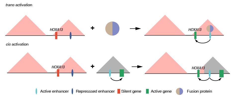 通过比对T-ALL与正常T细胞之间的三维基因组和基因表达差异,研究者发现T-ALL中29%的差异表达基因存在不同尺度基因组三维结构变化,提示T-ALL基因组三维结构改变同基因表达差异密切相关。研究人员同时在14例病人样本中共检测到46个染色体易位事件,其中34个为首次报道,47%的相关断点处于非编码区。在检测出染色体易位的病人样本中,染色体易位都直接导致了致癌转录因子的异常表达,说明染色体易位是T-ALL的最主要驱动因素。研究人员继而对导致致癌转录因子HOXA13表达的染色体易位事件进行了深入分析发现,染色体易位通过两种方式改变HOXA13处的基因组结构并激活其表达: 一类染色体易位通过形成的融合蛋白结合于HOXA13的调控元件,激活HOXA13增强子,导致HOXA13表达;而另外一类则通过“增强子劫持”(enhancer hijacking)激活HOXA13表达。结合临床数据及外显子组数据分析发现HOXA13的表达同T-ALL病人的不良预后相关,HOXA13阳性病人更富集JAK-STAT通路突变,提示临床检测HOXA13表达可以帮助鉴别T-ALL易复发病人,HOXA13阳性病人可能会得益于JAK-STAT通路抑制剂治疗。