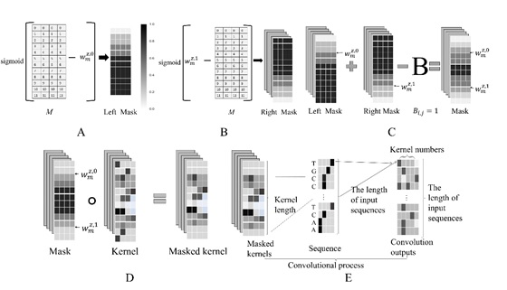 图一:vConv层结构。为了生成掩码矩阵(mask matrix),vConv使用两个对称的sigmoid函数生成了两个矩阵(A和B),然后通过叠加这两个矩阵获得了掩码矩阵(C)。在此基础上,vConv把该掩码矩阵与原始的卷积核做Hadamard积,获得了掩码内核(D),再将该掩码内核与输入序列进行卷积(E)。