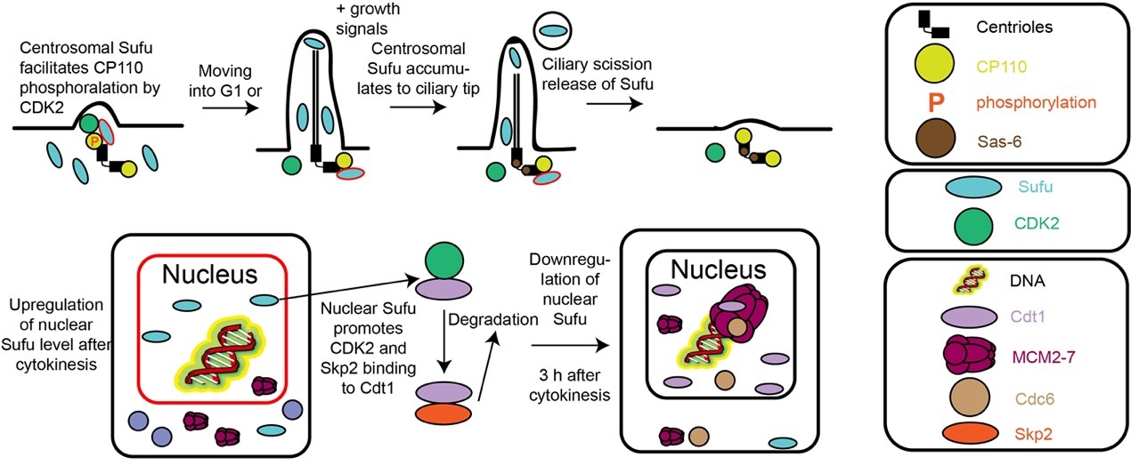 Sufu同时负调控中心体复制和DNA复制起始的分子机制示意图