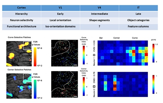 视觉的形状信息主要由大脑视觉皮层的腹侧通路(V1-V2-V4-IT)处理,这个过程中发生了由简到复杂的特征整合。初级视皮层V1主要编码简单、局部的特征如线段的朝向,而较高级的皮层IT主要编码较为复杂、整体的特征如物体类别。而这些视觉皮层的功能构建,如V1中的朝向区和IT中的特征柱也已广为人知。然而,对于位于它们中间的视皮层V4,虽然人们已经知道V4的神经元可以编码中等复杂度的特征,但并不知道这些特征是否也由特定功能区编码,V4的功能构建也未被完全揭示。