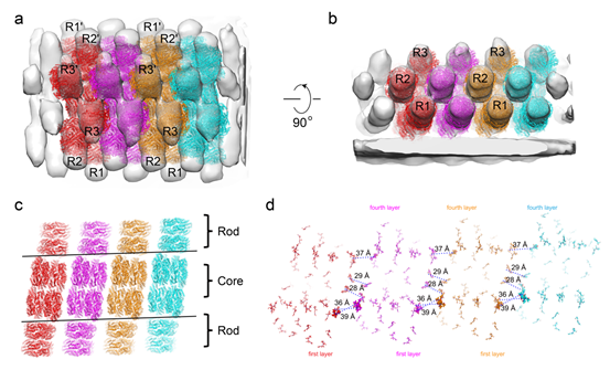 更为重要的是,在蓝细菌内部,藻胆体会在类囊体膜上有序排列形成巨大的PBS 阵列。通过把本研究中获得的PBS结构拟合到低分辨率的PBS阵列结构中(Rast et al., 2019),作者们发现相邻藻胆体之间的色素团距离很近,暗示藻胆体之间可能会存在着光能的传递。这些分析表明细胞内藻胆体在类囊体膜上可以形成一个复杂且高度相互交织的能量传递网络(图3a-d)。