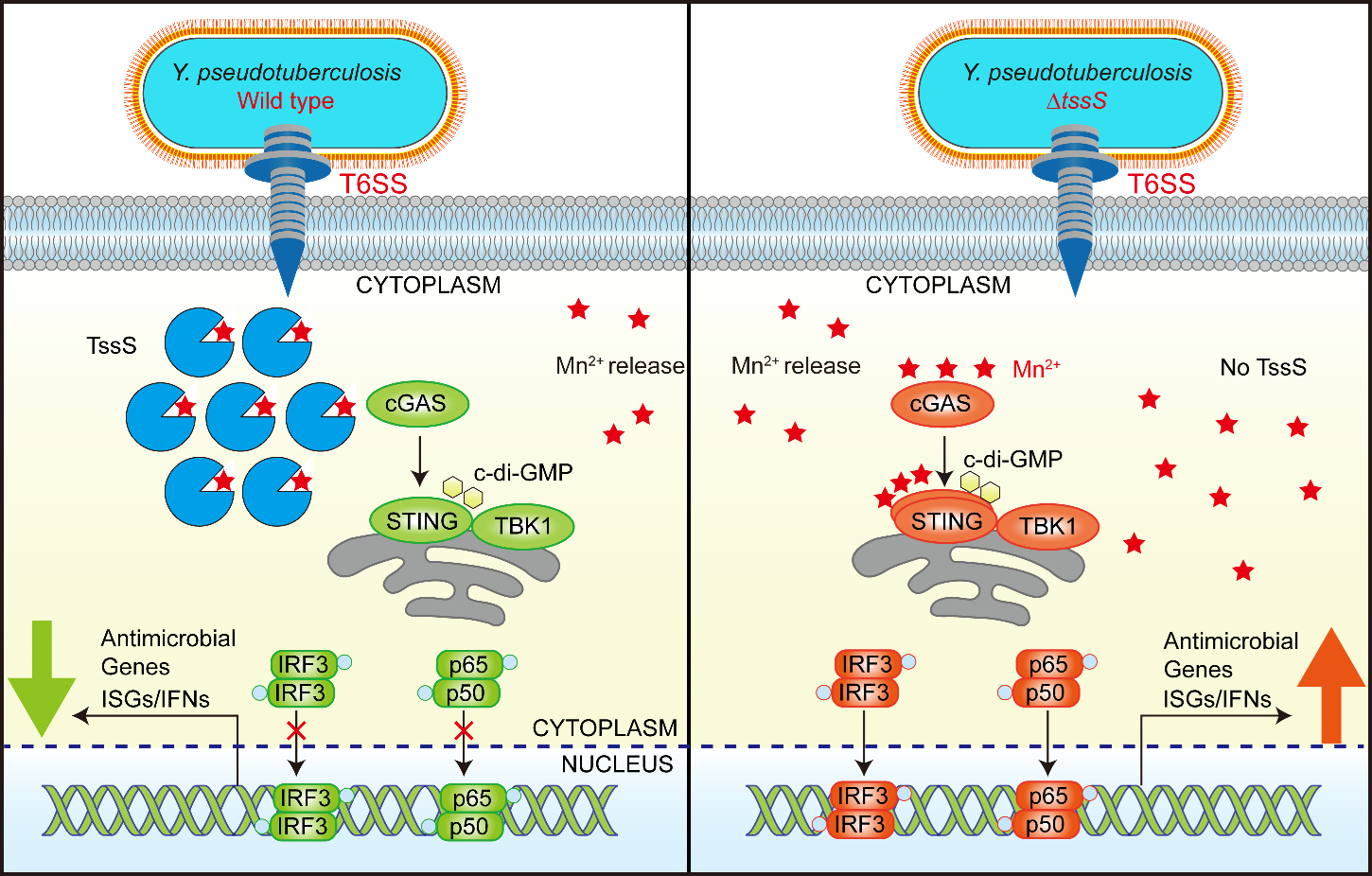 本研究发现革兰氏阴性菌假结核耶尔森氏菌(Y. pseudotuberculosis,Yptb)T6SS可分泌一个仅由48个氨基酸组成的锰离子结合蛋白TssS(T6SS-secreted micropeptide suppressing STING)促进细菌对锰离子的摄取。该基因缺失的突变体菌株(ΔtssS)对小鼠致病性显著下降,感染ΔtssS菌株小鼠的不同组织器官内细菌载量也明显下降。转录组学分析发现,与感染野生型菌株相比,感染ΔtssS菌株细胞内的I-型干扰素(Type I-IFNs)及干扰素刺激基因(IFN-stimulated genes, ISGs)表达明显上升,提示TssS能够抑制宿主抗细菌天然免疫反应;而将TssS中锰离子结合位点突变后,其对天然免疫系统的抑制能力和对小鼠的致病性显著下降,说明TssS的锰离子结合能力对其抑制天然免疫至关重要。进一步研究发现 LPS(革兰氏阴性菌细胞壁组分)处理能显著升高细胞质锰离子浓度,但在细胞中过表达TssS蛋白则能够抑制cGAMP/c-di-GMP所诱导的STING活化和下游基因表达。假结核耶尔森氏菌(Yptb)及同属的鼠疫杆菌(Y. pestis)和小肠结肠炎耶尔森菌(Y. enterocolitica)都产生对其存活、侵染非常重要的c-di-GMP。以往的研究表明锰离子可显著促进c-di-GMP与STING的结合。与此相一致,野生型Yptb或ΔtssS突变体感染野生型小鼠后,Yptb野生型感染的小鼠中细菌载量显著高于ΔtssS感染小鼠;而当这两种菌株分别感染STING缺失小鼠时,不同感染组之间细菌载量的巨大差异显著缩小。这些结果表明:一方面细菌产物LPS和c-di-GMP分别诱导宿主细胞内锰离子释放并共同促进STING活化;另一方面细菌产生并分泌TssS通过螯合胞内锰离子以削弱c-di-GMP对STING的结合及激活能力,实现对宿主抗细菌天然免疫反应的抑制。