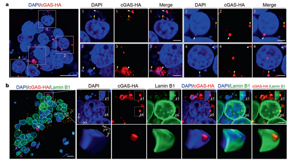 图1.细胞融合引起的染色质出核及cGAS对染色质片段的识别