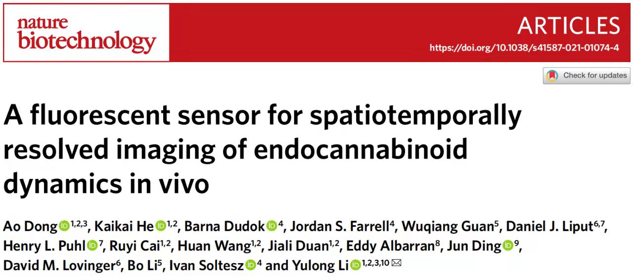 2021年11月11日,PA视讯游戏平台官网李毓龙实验室在Nature Biotechnology杂志在线发表了题为A fluorescent sensor for spatiotemporally resolved imaging of endocannabinoid dynamics in vivo的研究论文,报道了新型基因编码的内源大麻素探针GRABeCB2.0的开发和在体内外多种场景下的应用。李毓龙实验室自2018年以来,先后开发了针对乙酰胆碱、多巴胺、去甲肾上腺素、腺苷、五羟色胺等神经递质/调质的荧光探针,此次发表的GRABeCB2.0是其又一力作,进一步扩展了GRAB系列荧光探针家族。