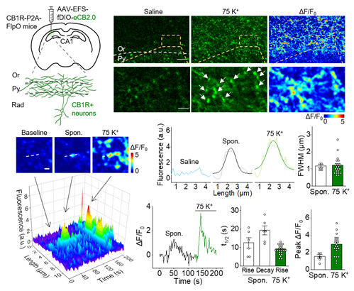 那么,eCB2.0能否用来检测神经元释放的eCB ?作者先从体外培养的原代神经元入手,证明eCB2.0能够检测到电刺激引发的来自神经元的eCB释放。通过药理学方法,作者发现此时神经元释放的eCB类型主要为2-AG。此外,作者还发现,即使不给予电刺激,也能记录到离散分布的直径约为10微米的自发性eCB2.0信号,表明eCB的释放具有特异和局部的特性。在急性脑片这一更接近生理条件的体系中,电刺激和高钾溶液刺激均能引起eCB的释放,其局部释放的特点也再次被验证:eCB2.0能够以单个轴突扣结(bouton),即单个突触的空间分辨率,检测到海马体CB1R阳性神经元上的eCB信号(图三)。