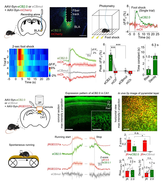 基底外侧杏仁核(basolateral amygdala, BLA)是介导恐惧反应和加工厌恶记忆的关键脑区。内源大麻素受体CB1R在此处有高水平的表达。为了研究活体动物在受到伤害刺激时BLA脑区处的eCB动态变化,作者借助AAV病毒在小鼠BLA表达eCB2.0探针并使用光纤记录的手段成功检测到给予小鼠足部电击时的BLA脑区中eCB的信号。另一方面,在海马体CA1脑区,作者使用活体双光子双色显微成像的方式,记录了小鼠跑步时CA1区神经元的钙信号和eCB信号,发现跑步行为总是伴随着CA1神经元的兴奋以及eCB信号的上升,表明eCB2.0探针能够实时检测小鼠在生理条件下(运动过程中)大脑中内源大麻素的动态变化(图四)。
