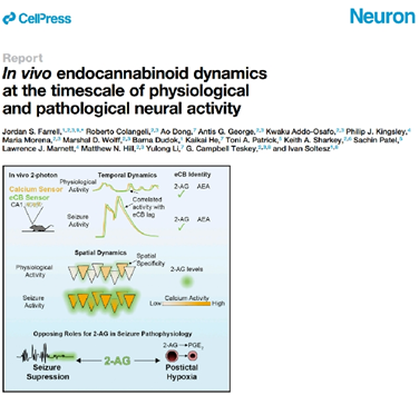 图五:Ivan Soltesz实验室借助eCB2.0探针解析了活体动物海马体内源大麻素信号的分子特性和时空动态。他们发现,相较于正常生理活动时,癫痫引起大量2-AG的释放,而2-AG为长时程的中风样症状提供了基础底物(Farrell et al, 2021)。