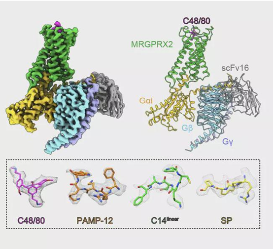 图一 不同配体作用下痒觉受体MRGPRX2与Gi蛋白三聚体复合物的结构