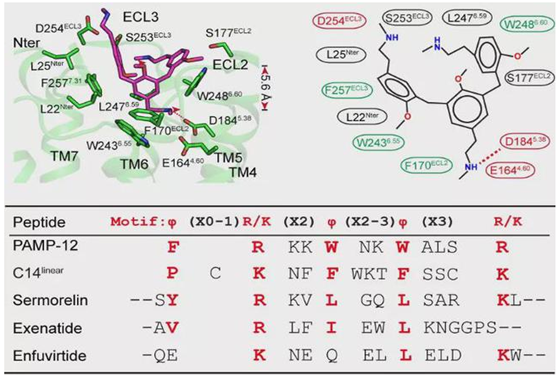另外许多内源短肽以及FDA批准的多种短肽类药物也可以激活MRGPRX2,引起肥大细胞脱颗粒反应,研究人员通过分析多个短肽的结构及生化细胞数据,发现了受体识别短肽类配体的通用基序,即φp9(X0-1) R/Kp10(X2) φp13(X2-3) φp16(X3) R/Kp20(图三),含有该基序的短肽可以激活MRGPRX2引起瘙痒。该研究深入揭示了痒觉受体识别不同配体的通用机制,为临床开发避免瘙痒等副作用的药物提供了理论依据。