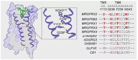 传统的GPCR通过第六个跨膜螺旋(TM6)中 “toggle switch” 色氨酸 W6.48的构象改变使受体激活,但在MRGPRX2中,该位置的W6.48被甘氨酸G6.48替代 ,更有趣的是,G6.48与TM3上的Y3.36形成氢键,使TM6形成一个显著的上侧弯折,这种特殊的结构方式介导了痒觉受体MRGPRX2的激活,同时TM6中参与激活的关键motif G6.48XXF6.52以及TM3中Y3.36在整个MRGPRX家族都是保守的(图四),因此这是痒觉受体特有的全新激活模式,这些新的发现扩展了人们对GPCR激活机制的认识。