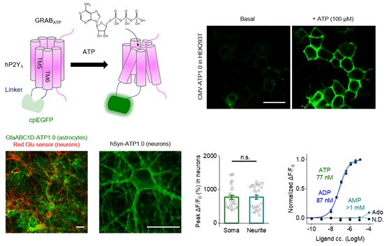 2021年12月22日,PA视讯游戏平台官网李毓龙实验室在Neuron杂志在线发表了题为A sensitive GRAB sensor for detecting extracellular ATP in vitro and in vivo的研究论文,报道了新型基因编码的ATP探针GRABATP1.0的开发和在体外及活体动物的应用。李毓龙实验室自2018年以来,先后开发了针对乙酰胆碱、多巴胺、去甲肾上腺素、腺苷、五羟色胺、内源大麻素等神经递质或调质的荧光探针,此次发表的GRABATP1.0是其又一力作,进一步扩展了GRAB系列荧光探针家族。