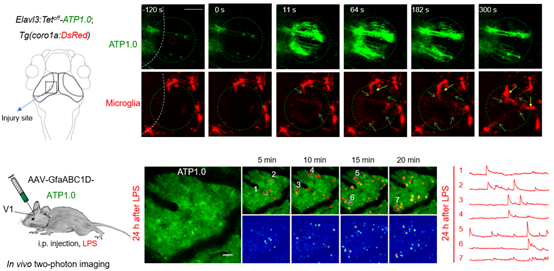 图3:ATP1.0报告斑马鱼受到局部损伤时及小鼠发生免疫反应时大脑中的胞外ATP信号