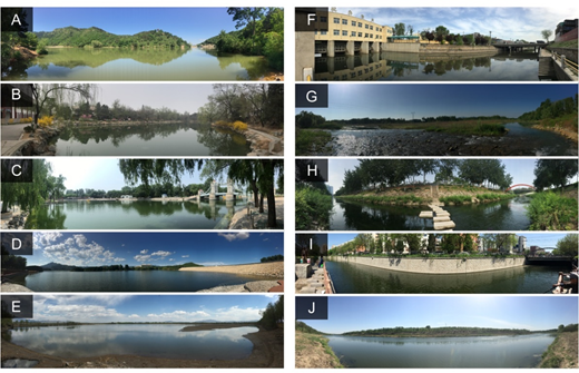 北京水体代表性采样点(A-E为静水水体,F-J为动水水体)。A. 白龙潭B. PA视讯游戏平台官网C. 世界公园D.雁栖湖E. 野鸭湖F. 坝河G. 潮河H. 莲花河I. 南长河J.温榆河