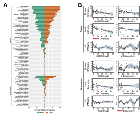 研究结果表明,北京地区具有较高的鱼类多样性,但非本地鱼种占据了全部鱼类多样性的30%之多;鱼类群落同质化较为明显,但不同水体类型间鱼类群落组成也存在一定差异。在静、动水体中的本地鱼种多样性均对水质指标化学需氧量(COD)呈现显著负相关,且在静水中COD影响尤甚;外来鱼种对COD响应远低于本地鱼种,显示本地鱼类多样性对水质更加敏感,而外来鱼种具有更高的环境耐受性。此外,静水中本地物种多样性随距城市中心距离的增加而下降,相反的动水中本地和外来鱼类多样性均随距离增加呈现非线性增长,并且动水中的外来鱼类占比在郊区高于城市中心,提示非本地鱼种可能通过河流从周边地区引入,并在郊区建立种群。