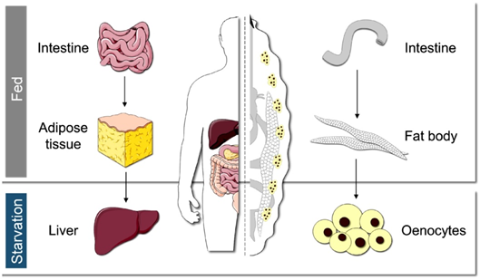图1. 人类(左)和果蝇(右)的脂质代谢调控示意图
