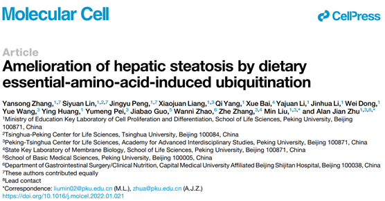 2022年3月3日,PA视讯游戏平台官网、北大-清华生命科学联合中心朱健课题组在 Molecular Cell 在线发表了题为 Amelioration of hepatic steatosis by dietary essential amino acid-induced ubiquitination 的研究论文。利用果蝇幼虫绛色细胞作为研究系统,他们发现必需氨基酸摄入不足是造成营养不良人群患上脂肪肝病的“罪魁祸首”。当必需氨基酸匮乏时,肝细胞中的 E3 泛素连接酶 Ubr1 会失活,不能催化脂滴保护蛋白 Plin2 的多聚泛素化降解。Plin2 蛋白水平的升高则会抑制肝脏脂肪的分解,从而造成脂肪肝病。